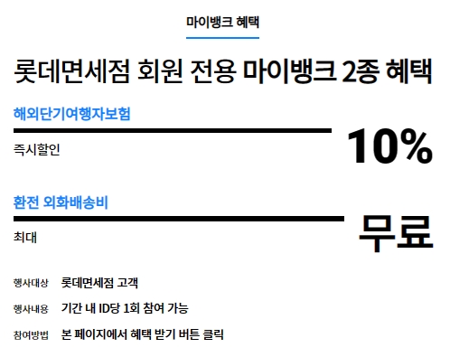 롯데면세점 회원전용 마이뱅크 2종 혜택으로는 해외단기여행자보험 10% 즉시할인 및 환전 외화배송비 최대 0원(무료) 제공이 있습니다. 행사대상은 롯데면세점 고객이고, 기간내에 아이디당 1회 참여가 가능합니다.