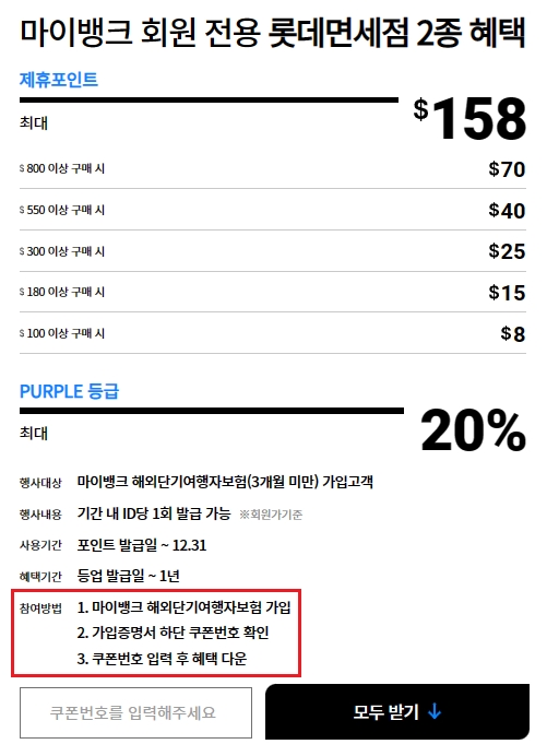 구매금액에 따라서 최저 8달러부터 최고 158달러까지 제휴포인트 혜택이 있습니다. 마이뱅크 해외단기여행자보험(3개월 미만) 가입고객에 대하여 PURPLE등급 기준 최대 20%까지 포인트 혜택을 제공하는데요, 기간내 아이디당 1회 발급이 가능합니다.